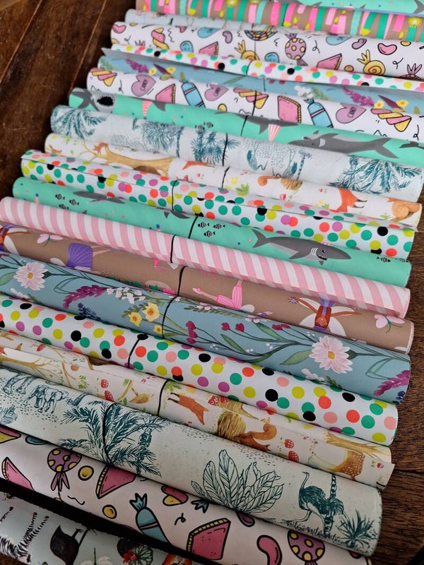 Deze mix bestaat uit 10 rollen cadeaupapier van 30cm breed en 1 meter lang.